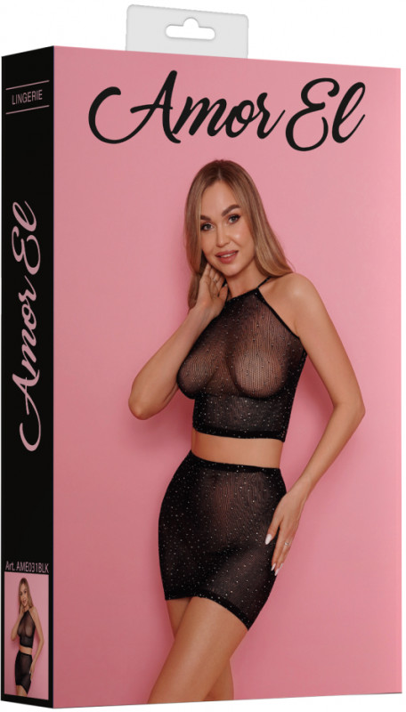 Укороченный топ и мини юбка выполнены из эластичной бесшовной сетки в черном цвете. Декор из кристаллов придает образу особенный шарм